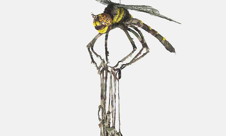 Image: Fiona Hall, Macromia splendens / splendid cruiser, 2009-2011, military camouflage material, paint, mixed media. National Gallery of Australia, Kamberri/Canberra, Purchased 2016. © Fiona Hall/Copyright Agency, 2025.