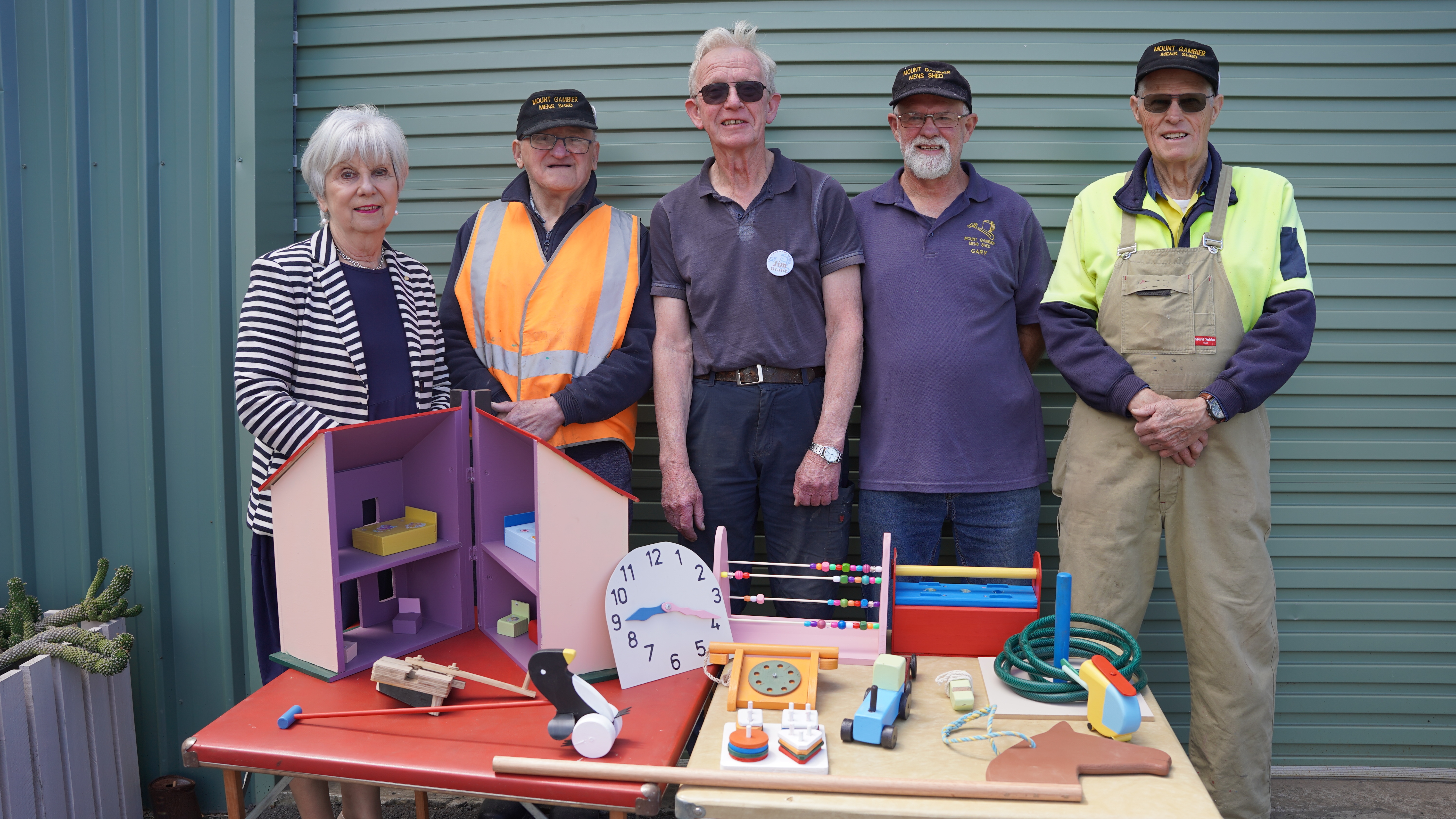 “The toy makers spend much of the year making these toys, including a doll house, clock, bean counter, knock through game, ring toss, whistle, telephone hobby horse and a push penguin,” Mount Gambier Men’s Shed volunteer Ian Bond said.